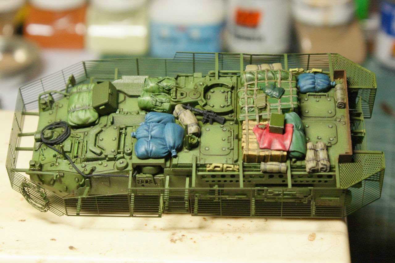 Model od Trumpeteru v mierke 1:72 je relatívne jednoduchá stavebnica. K nej som dokúpil kovové sady od Eduarda na kompet SLAT armor (22127 a 22129) a vezenú batožinu od Legend Production (7208). K tomu pribudli aj podomácky vyrobené detaily. Aby to celé vyzeralo akčnejšie, model som umiestnil na podložku, ktorá by mala zobrazovať nasadenie amerických vojakov do akcie. Figúrky sú zo sady Modern US Army od Caesar Miniatures (H030).